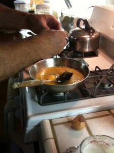 - Stir in the sugar and then quickly add the eggs and beat until well blended. The eggs will cook slightly, but that's OK.