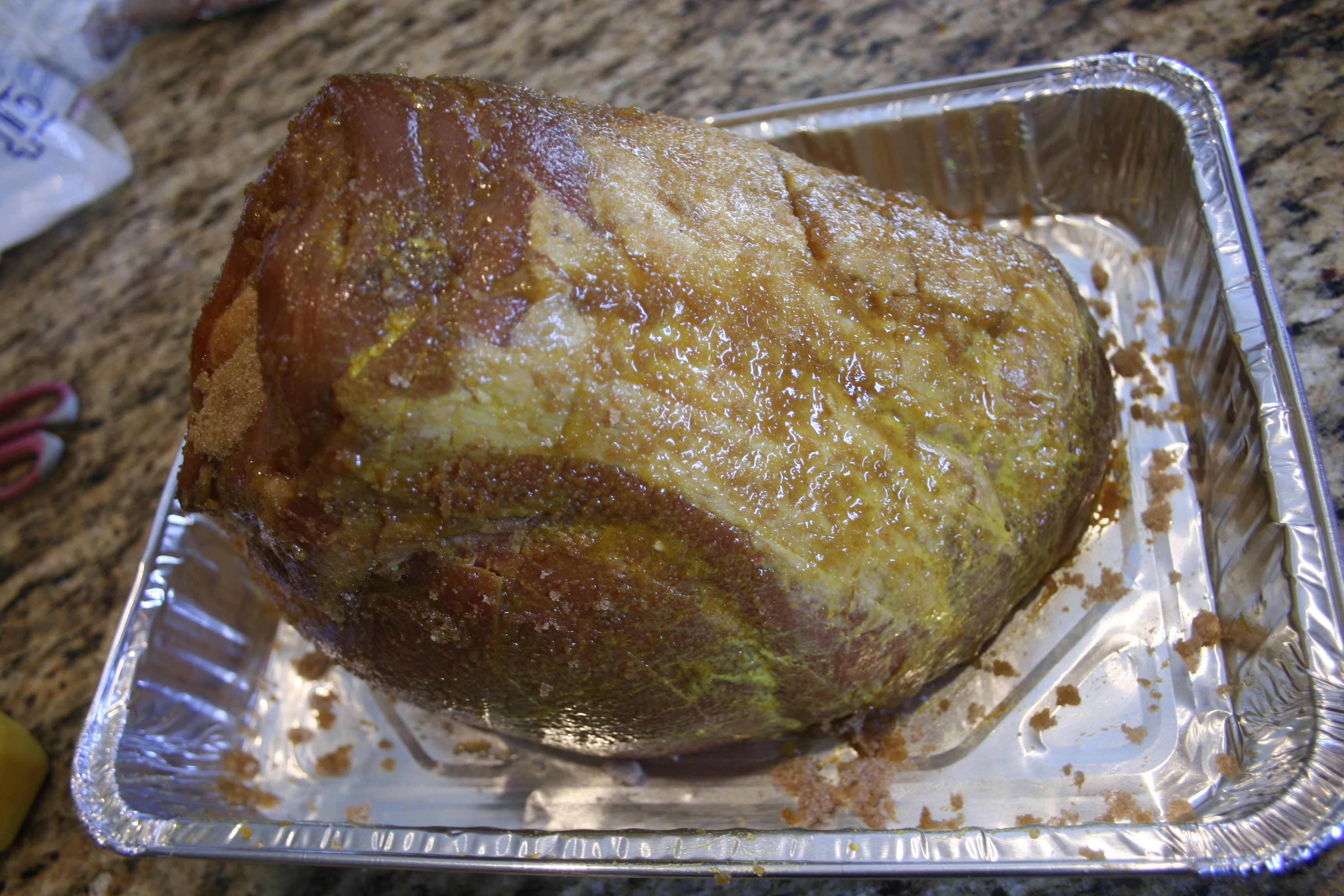 First, Score your ham in a criss cross pattern with a sharp knife, this allows flavors to penetrate the fat layer. Once you've scored it, coat the outside in yellow mustard. You can use dijon for a kick if you like. It will look like this